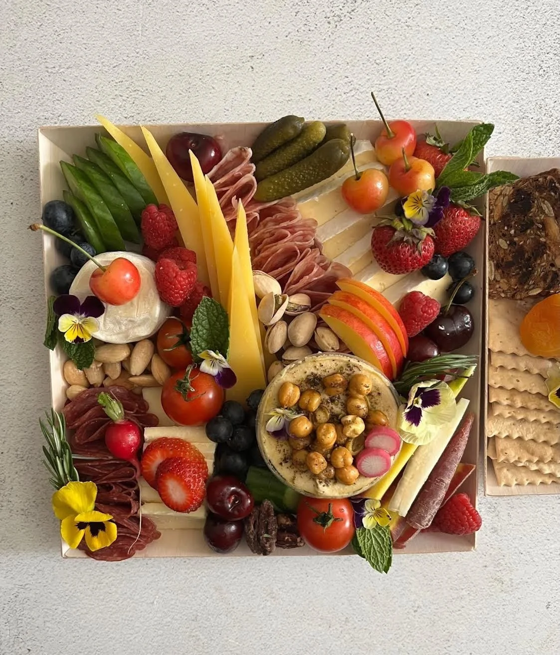 All boards are custom made, and we try our best to accommodate all requests. Keep in mind the recommended serving sizes are based on appetizer portions. If you would like heavier portions we recommend sizing up. Our boards do not include crackers or bread, so be sure to add to the order or have on hand for serving.
